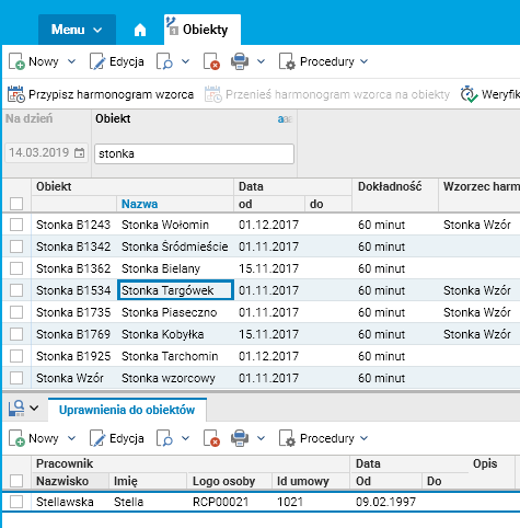 W szczególe Uprawnienia do obiektu musi być przypisany przynajmniej jeden pracownik. Pracownik przypisany w tym szczególe otrzymuje uprawnienia do procedury Generuj harmonogram pracownikom.