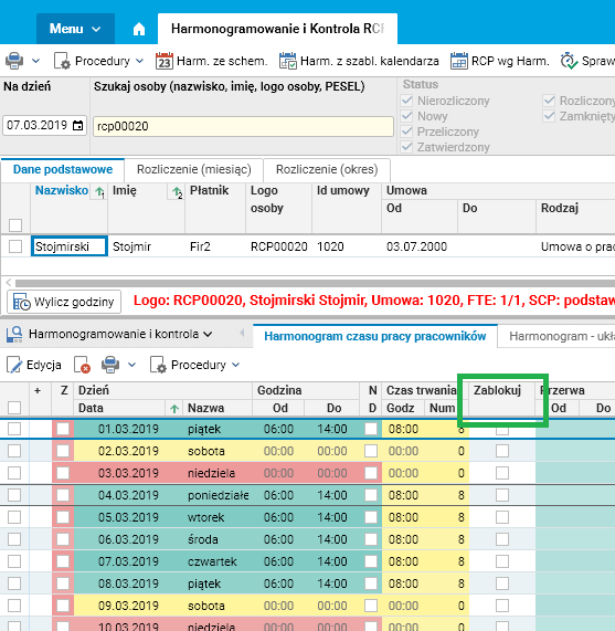 Każde uruchomienie procedury usuwa poprzednio wygenerowany harmonogram w wybranym okresie, ale istnieje możliwość oznaczenia wiersza w harmonogramie dla pracownika, który musi pozostać. Służy do tego opcja Zablokuj i jest dostępna w szczególe Harmonogram czasu pracy pracowników w słowniku Harmonogramowanie i kontrola RCP.