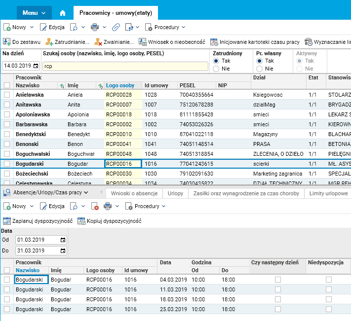 Rys. Szczegół Dyspozycyjność pracownika w słowniku Pracownicy – umowy(etaty)
