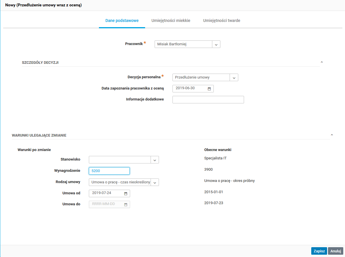 Rys. Przedłużenie umowy wraz z oceną, zakładka Dane podstawowe