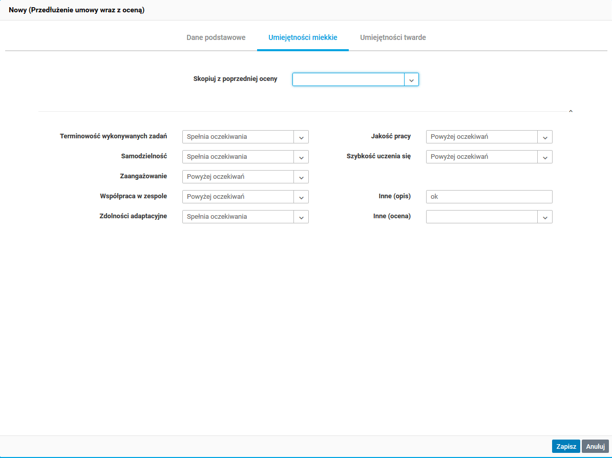 Rys. Przedłużenie umowy wraz z oceną, zakładka Umiejętności miękkie