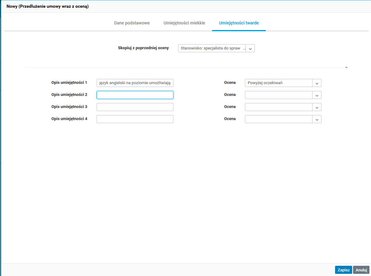 Rys. Przedłużenie umowy wraz z oceną, zakładka Umiejętności twarde