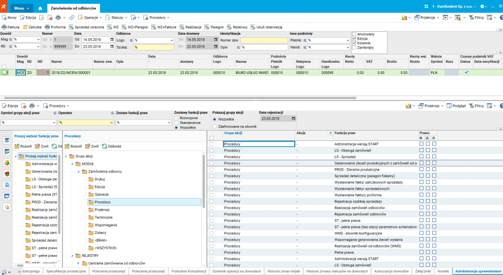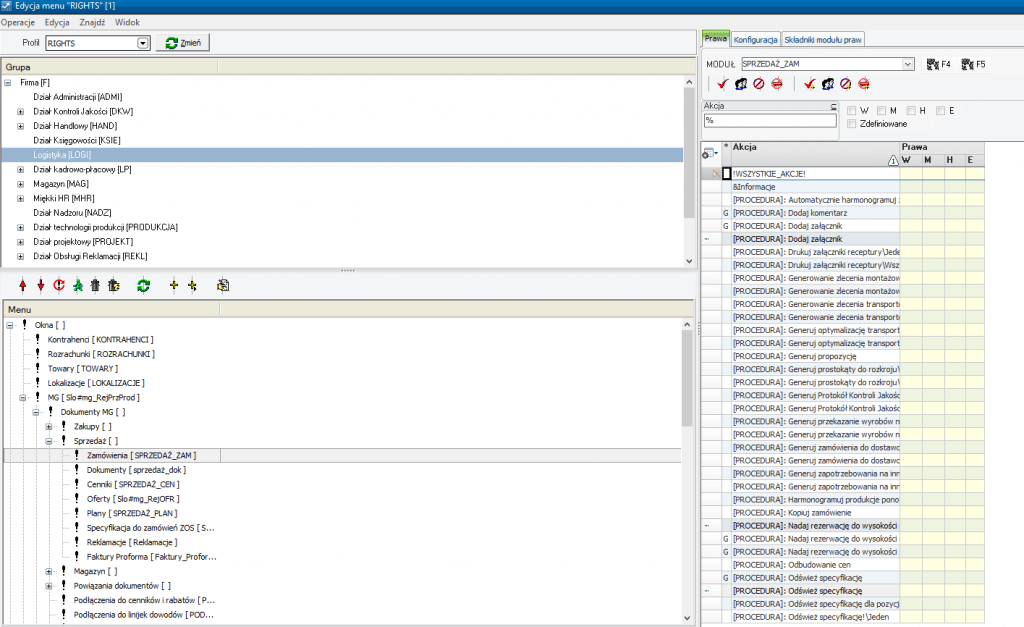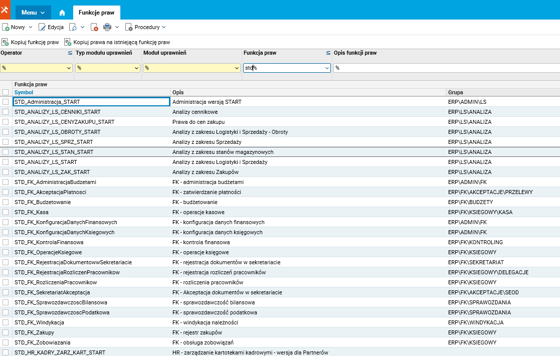 W starym systemie uprawnień, prawa nadawane były w kontekście operatorów systemu lub w kontekście elementów hierarchii organizacyjnej firmy. Oznaczało to, że każde wdrożenie musiało zaczynać konfigurację praktycznie „od zera”. W nowym systemie istnieją tzw. funkcje praw, które są kontenerami zawierającymi zbiór uprawnień. I to jest siła nowego systemu uprawnień. Możliwe jest zebranie w funkcji praw uprawnień do funkcjonalności, a potem można grupowo nadawać uprawnienia użytkownikom przypisując im tę funkcję praw. Co więcej, można zdefiniować funkcję praw, która zbiera uprawnienia pozwalające zrealizować proces w systemie, czyli definiujące rolę użytkownika. Przypisanie takiej funkcji użytkownikowi da mu dostęp do procesu. System standardowo dostarcza wiele funkcji praw, które mogą być od razu wykorzystane lub dostosowane do potrzeb klienta na wdrożeniu.
