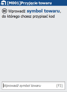 Operacja przypisania kodu kreskowego do towaru rozpoczyna się od wprowadzenia symbolu towaru, do którego chcemy przypisać kod kreskowy. Następnie pobierana jest wartość kodu kreskowego.