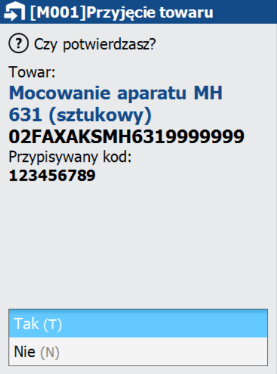 System sprawdza, czy wprowadzony kod kreskowy został już przypisany do innej kartoteki. W momencie gdy nastąpi taka sytuacja, informuje użytkownika o tym fakcie, a także pyta, czy operator chce mimo tego kontynuować operację. Rezygnacja powoduje powrót do wprowadzania kartoteki w przyjęciu.