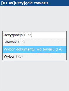 Ekran wyboru dokumentu w procesie przyjęcia towaru został rozszerzony o dostępną w menu podręcznym opcję Wybór dokumentu wg towaru (F4).