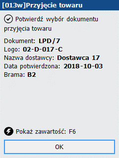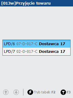 Jeżeli istnieje jeden dokument przyjęcia dla wybranego magazynu i bramy, na którym znajduje się wprowadzony towar, proces od razu przejdzie do ekranu potwierdzenia wyboru dokumentu. W przypadku gdy istnieje więcej niż jeden dokument przyjęcia dla wybranego magazynu i bramy, na którym znajduje się wprowadzony towar, zostanie wyświetlona lista dokumentów awizo. Bez wskazania dokumentu nie jest możliwa realizacja procesu.