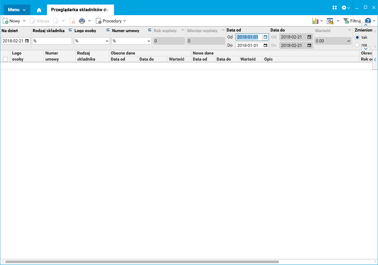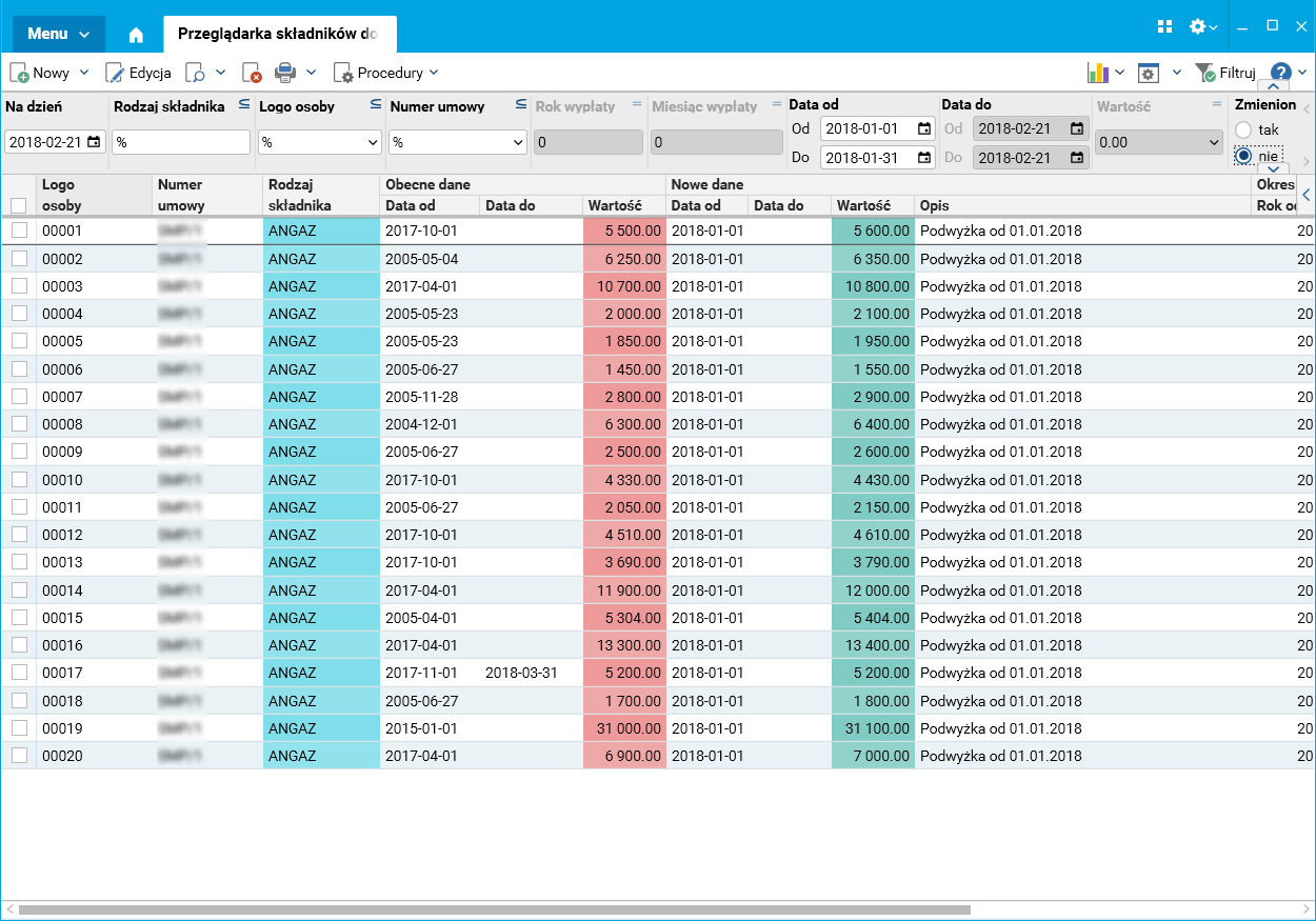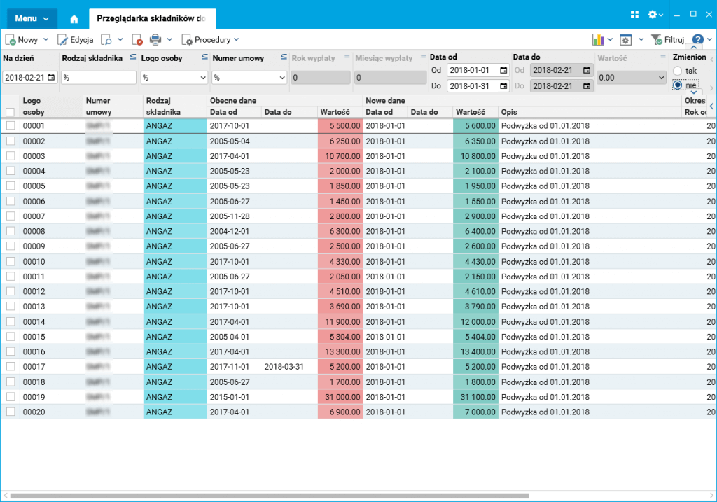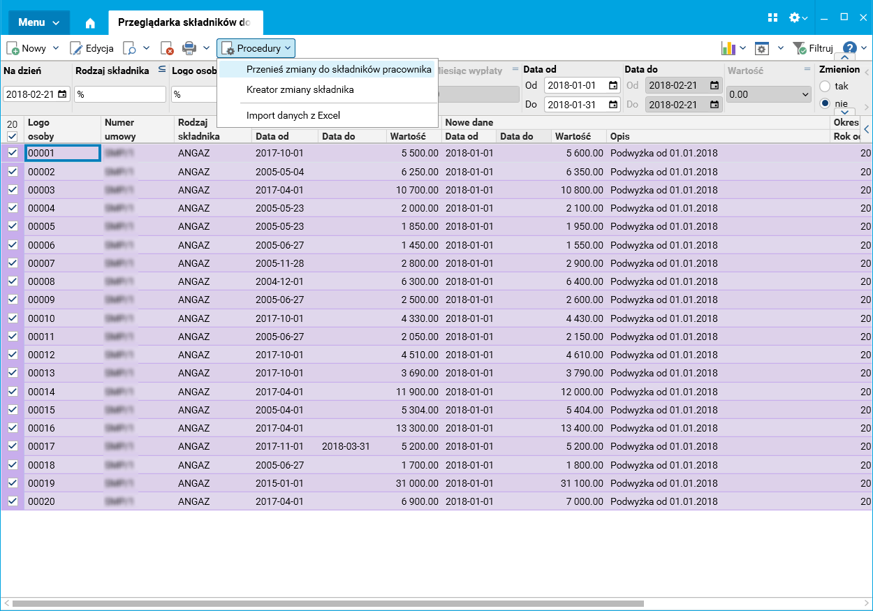 Po wykonaniu importu w słowniku Przeglądarka składników do zmiany widoczne są poprzednie wartości zmienianego składnika wraz z ich datami obowiązywania. Na tym etapie użytkownik może sprawdzić poprawność zaimportowanych danych oraz je zmodyfikować. Przeglądarka składników do zmiany umożliwia filtrowanie danych według różnych kryteriów. Przede wszystkim można zobaczyć pracowników, którym już zostały zmienione dane, co znacząco ułatwia pracę użytkownikowi.