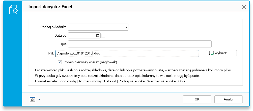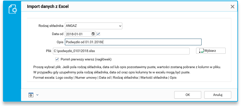 W naszym przypadku importowany plik zawiera zmienione wartości jednego składnika z taką samą datą obowiązywania i opisem dla wszystkich pracowników, dlatego podajemy te dane na formularzu, a importowany plik nie musi ich zawierać.