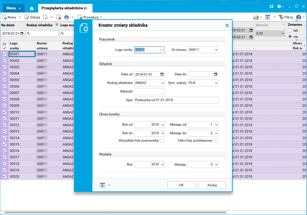 W wyniku prac dodatkowych, z uwzględnieniem specyfiki i potrzeb użytkowników klienta, został wykonany nowy mechanizm opierający się na słowniku Przeglądarka składników do zmiany. Nowo utworzony słownik umożliwia szybki, masowy import danych, np. nowych stawek wynagrodzenia dla dużej grupy pracowników, które następnie w prosty sposób mogą zostać przeniesione do kartoteki składników pracownika, z wcześniej przygotowanego pliku w formacie Excel. Co ważne, nowe stawki mogą obowiązywać z datą wsteczną, a nowy mechanizm umożliwia obsłużenie procesu naliczenia wyrównań wynagrodzeń.
