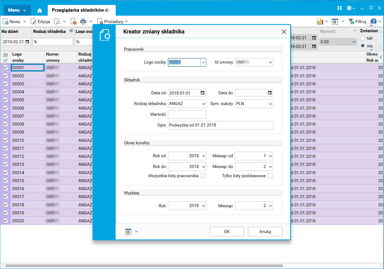 Dział HR co jakiś czas spotyka się z potrzebą grupowej zmiany wartości, takich jak wprowadzanie podwyżek, zmiany wartości pakietów ubezpieczeniowych, medycznych lub sportowych, lub przypisania nowych składników pracownika. Proces ten powinien być szybki i bezpieczny oraz rozliczać skutki wprowadzonych zmian.