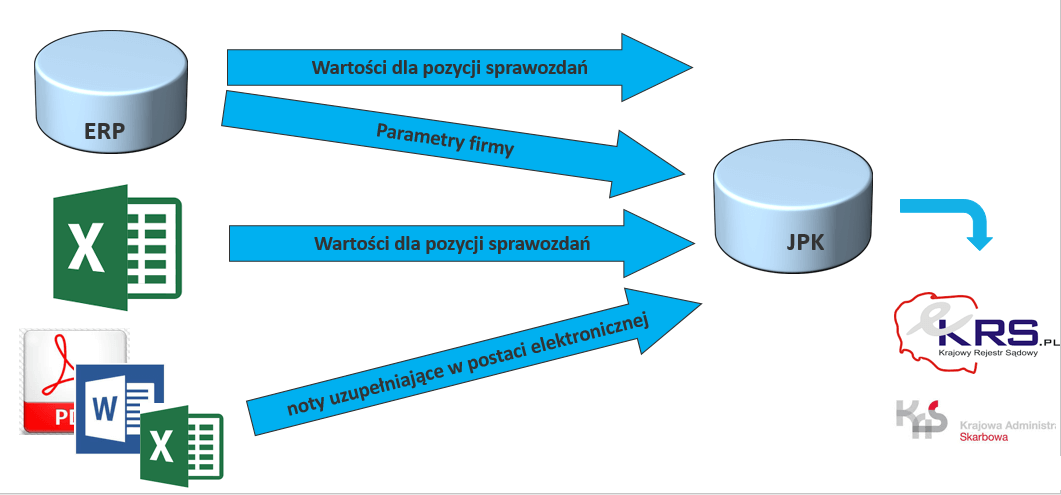 ·         moduł JPK (baza JPK) – tu kompletuje się paczkę z wymaganymi sprawozdaniami cząstkowymi, pobierając dane z modułu FK lub z plików xls. Paczkę uzupełnia się o dodatkowe objaśnienia w postaci załączników. Na podstawie zgromadzonych danych generuje się plik xml, który po uprzednim podpisaniu można pobrać i zamieścić na stronie e-KRS lub wysłać za pomocą interfejsu do KAS;