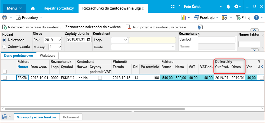 Faktura sprzedaży została wystawiona 1.10.2018 r. z terminem płatności 15.10.2018 r. Do dnia 31.01.2019 r. nie została zapłacona. Ponieważ 90 dni od terminu płatności upływa z dniem 13.01.2019 r., powinien być zastosowany nowy algorytm i korekta z tytułu ulgi będzie naliczona już w styczniu 2019 roku. Według poprzednich zasad powinna być naliczona dopiero w marcu.