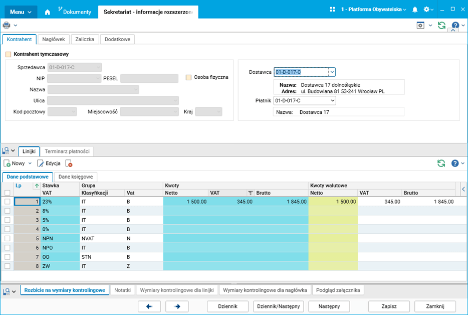 W nowym rejestrze operator pracuje na linijkach dokumentu, a nie na stopce VAT. Zmiana jest w praktyce niezauważalna dla użytkownika, gdyż edycja linijek naśladuje edycję stopki VAT. Na linijkach nie ma pokazanej kartoteki materiałowej ani ilości, a po zapisaniu danych nagłówka w linijkach podpowiadają się wszystkie aktywne stawki VAT.