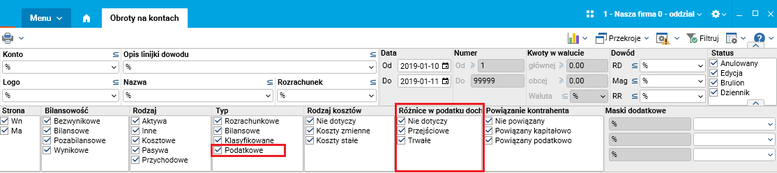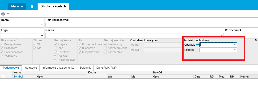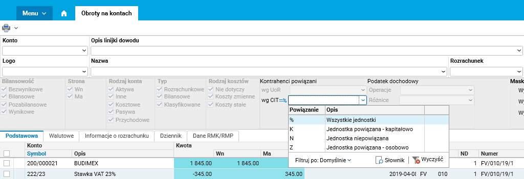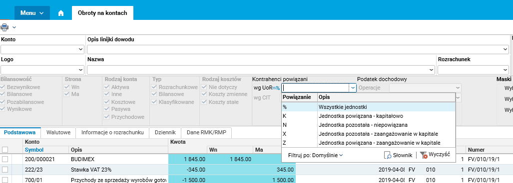 Filtry dodatkowe Podatek dochodowy i Różnice w podatku dochodowym słownika Obroty na kontach zostały dostosowane do zmian w atrybutach kont, tak aby łatwo można było odfiltrować konta oznaczone nowymi atrybutami podatkowymi. Ze względu na większą ilość wartości pola wyboru zamieniono na listy rozwijane. Zmiany objęły również filtr dotyczący rodzaju powiązania kontrahenta.