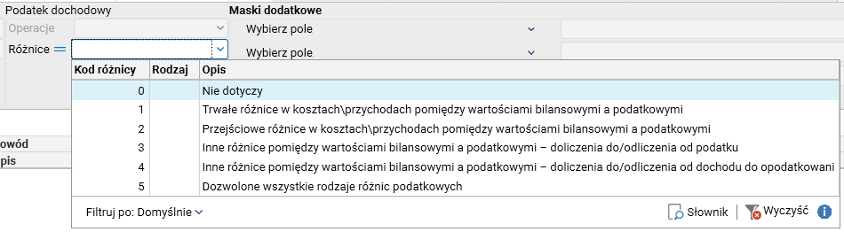 Rys. Wartości dostępne w nowym filtrze Podatek dochodowy – Różnice