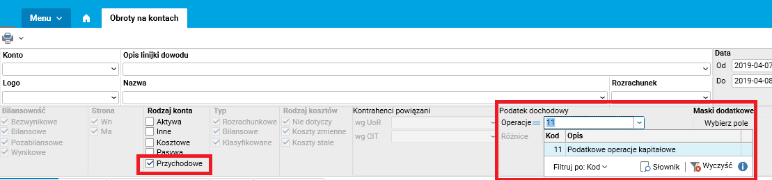 Przykładowo, w celu odfiltrowania operacji podatkowych kapitałowych na kontach przychodowych można zaznaczyć odpowiedni rodzaj konta oraz atrybut operacji dla podatku dochodowego 11 – Podatkowe operacje kapitałowe.