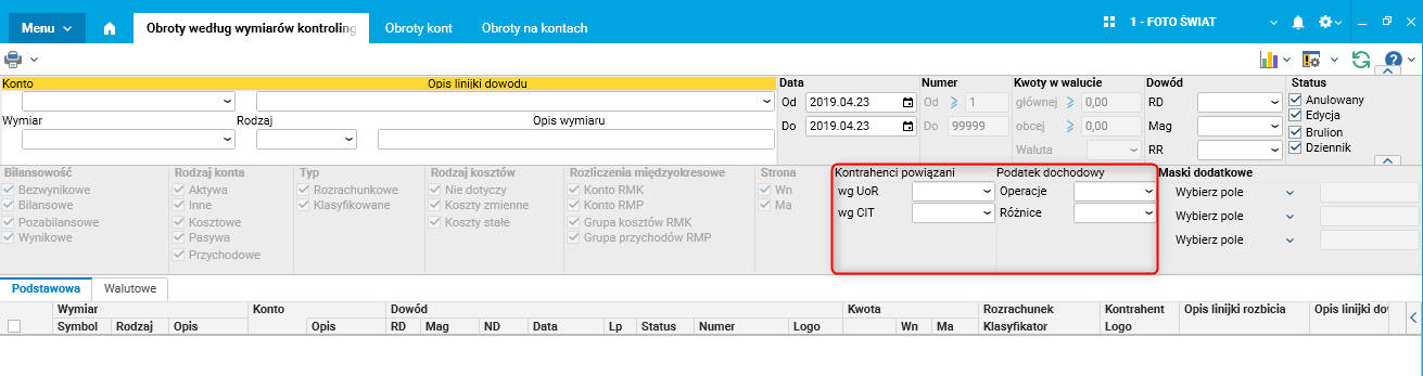 Filtry słownika Obroty według wymiarów kontrolingowych zostały zmodyfikowane podobnie jak w słowniku Obroty na kontach. Wprowadzono listy rozwijane dla powiązań kontrahenta oraz dla operacji i różnic podatkowych.