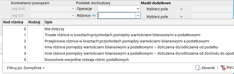 Rys. Wartości dostępne w nowym filtrze Podatek dochodowy – Różnice