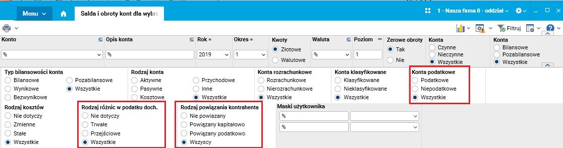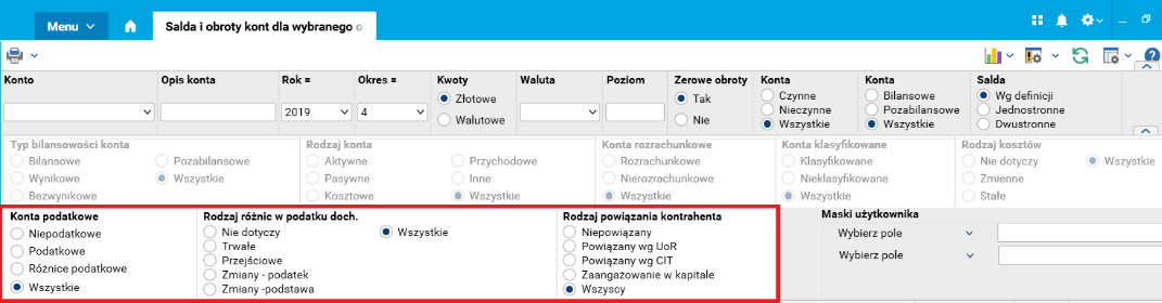 W słowniku Salda i obroty kont dla wybranego okresu zmodyfikowano filtry dodatkowe, umożliwiając wyszukiwanie po nowych atrybutach kont oraz nowych rodzajach powiązań między kontrahentami.