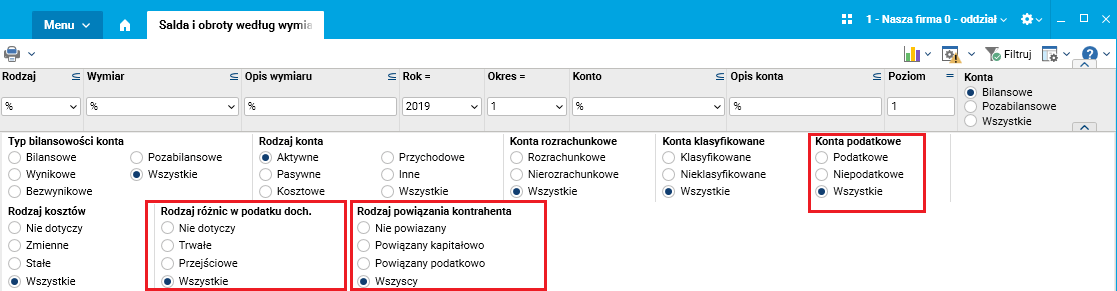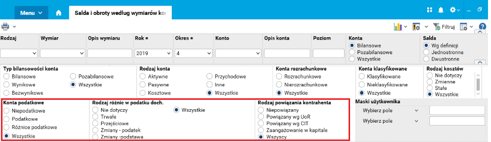 Filtry słownika Salda i obroty według wymiarów kontrolingowych dla wybranego okresu zostały zmodyfikowane analogicznie jak w słowniku Salda i obroty kont dla wybranego okresu.
