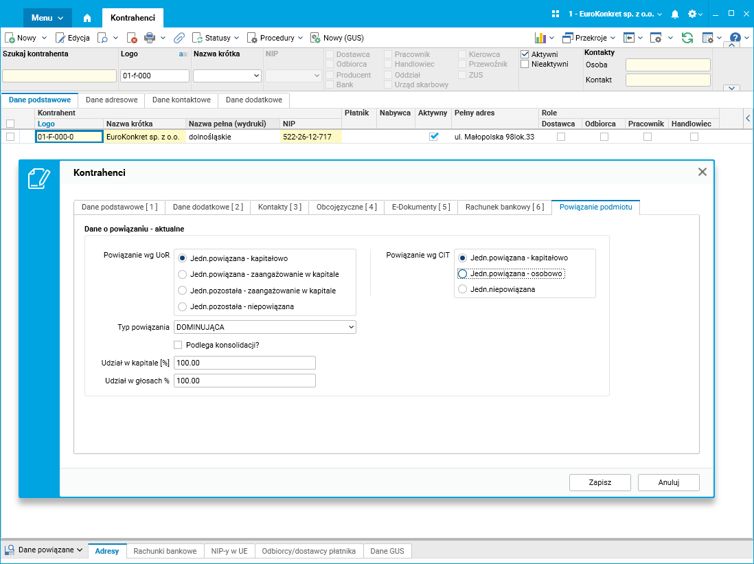 Podczas rejestrowania nowego kontrahenta w oknie edycyjnym można od razu uzupełnić informacje o powiązaniu podmiotu. Po zapisaniu rekordu trafią one automatycznie do słownika Podmioty powiązane.