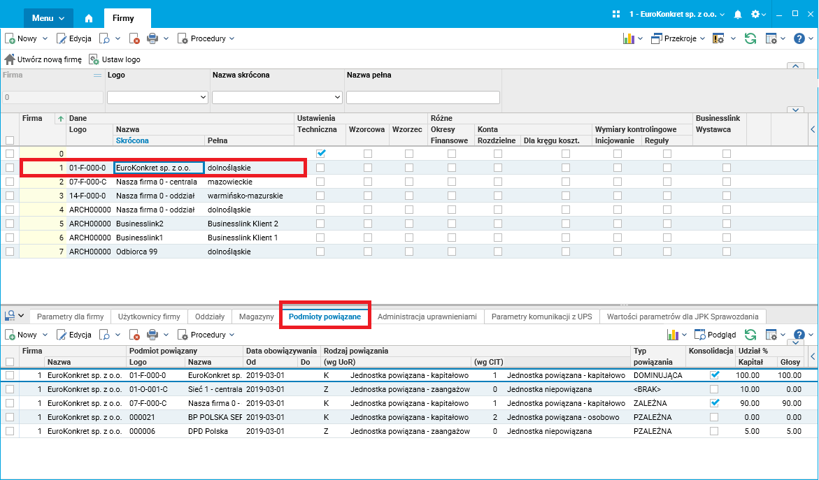Analogicznie jak w słowniku w słowniku Firmy w szczególe Podmioty powiązane zostały umieszczone tu następujące informacje: Powiązanie wg UoR, Powiązanie wg CIT, Typ powiązania, Podlega konsolidacji, Udział w kapitale [%] oraz Udział w głosach [%].
