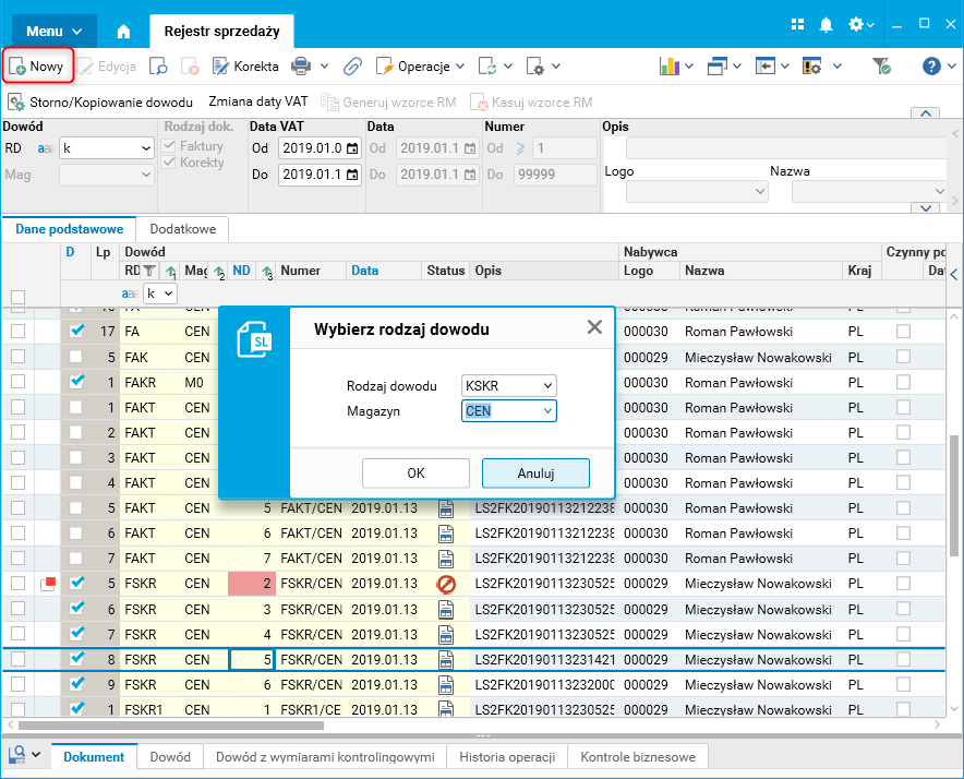 Wprowadzenie korekty bez dokumentu źródłowego rozpoczynamy od użycia przycisku akcji Nowy, następnie w polu Rodzaj dowodu wybieramy korektę usługową (w prezentowanym przypadku jest to rodzaj dowodu KSKR – Korekta faktury – Sprzedaż krajowa towarów i usług).