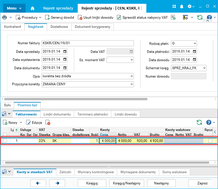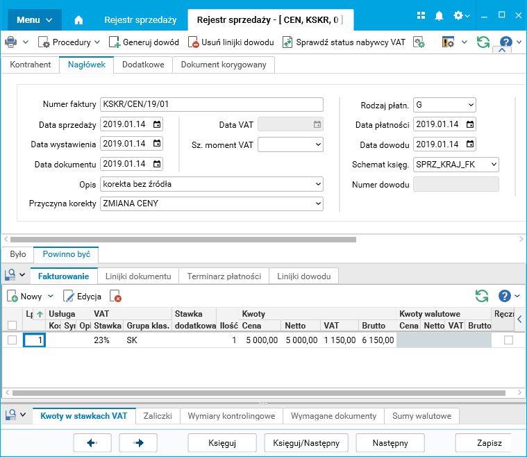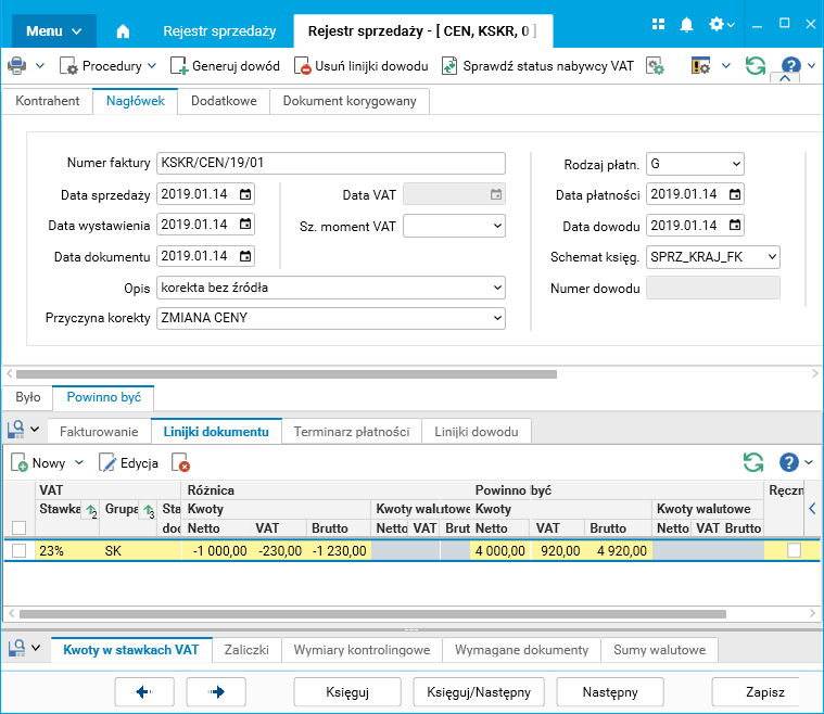Rys. Rejestr sprzedaży, zakładka Powinno być – wartości po korekcie