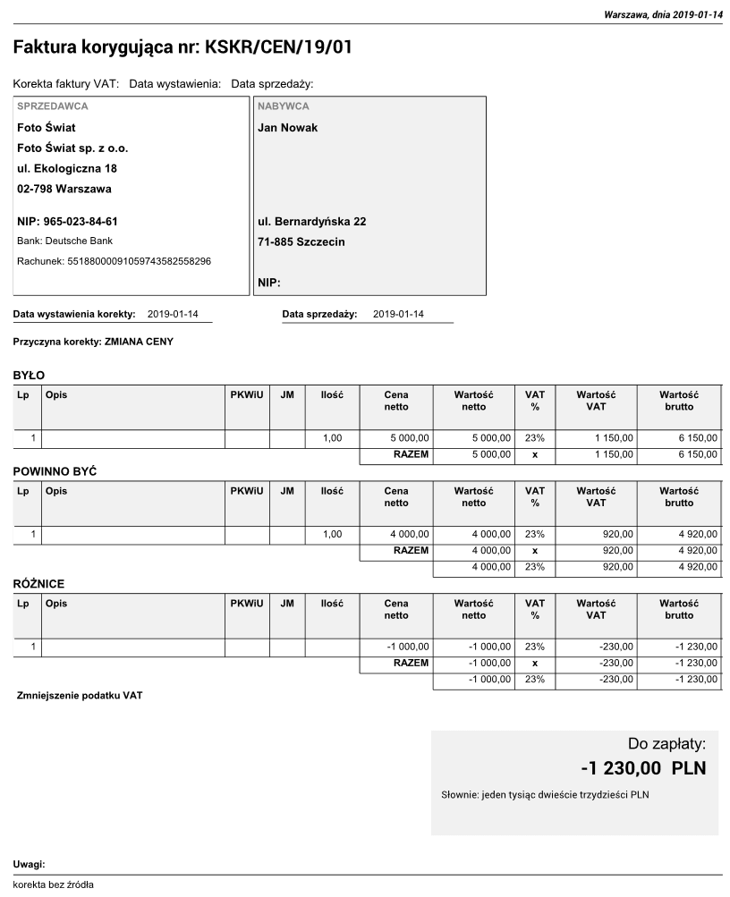Wydruk faktury korygującej wygląda następująco:
