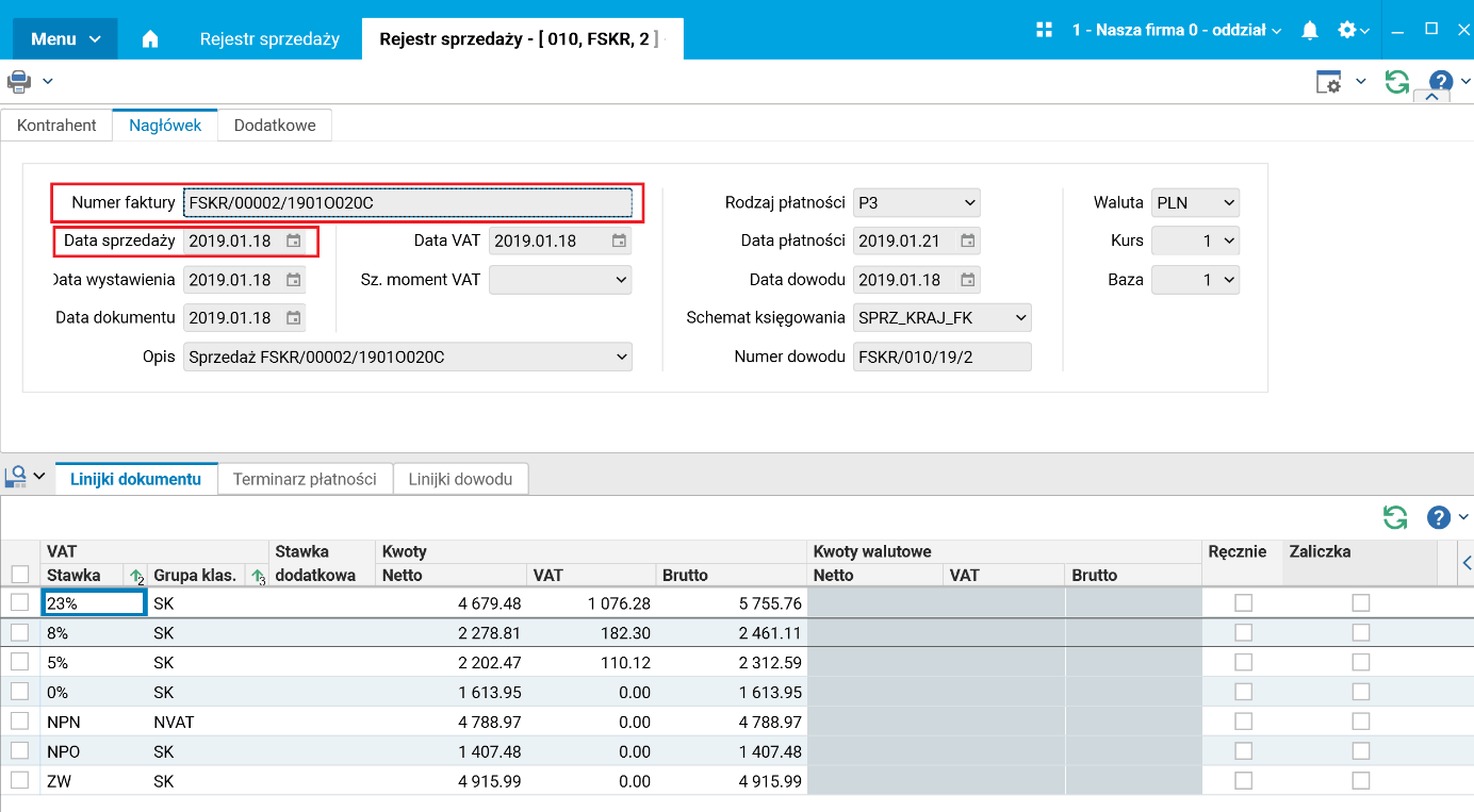 Rys. Rejestr sprzedaży – podgląd danych na fakturze sprzedaży