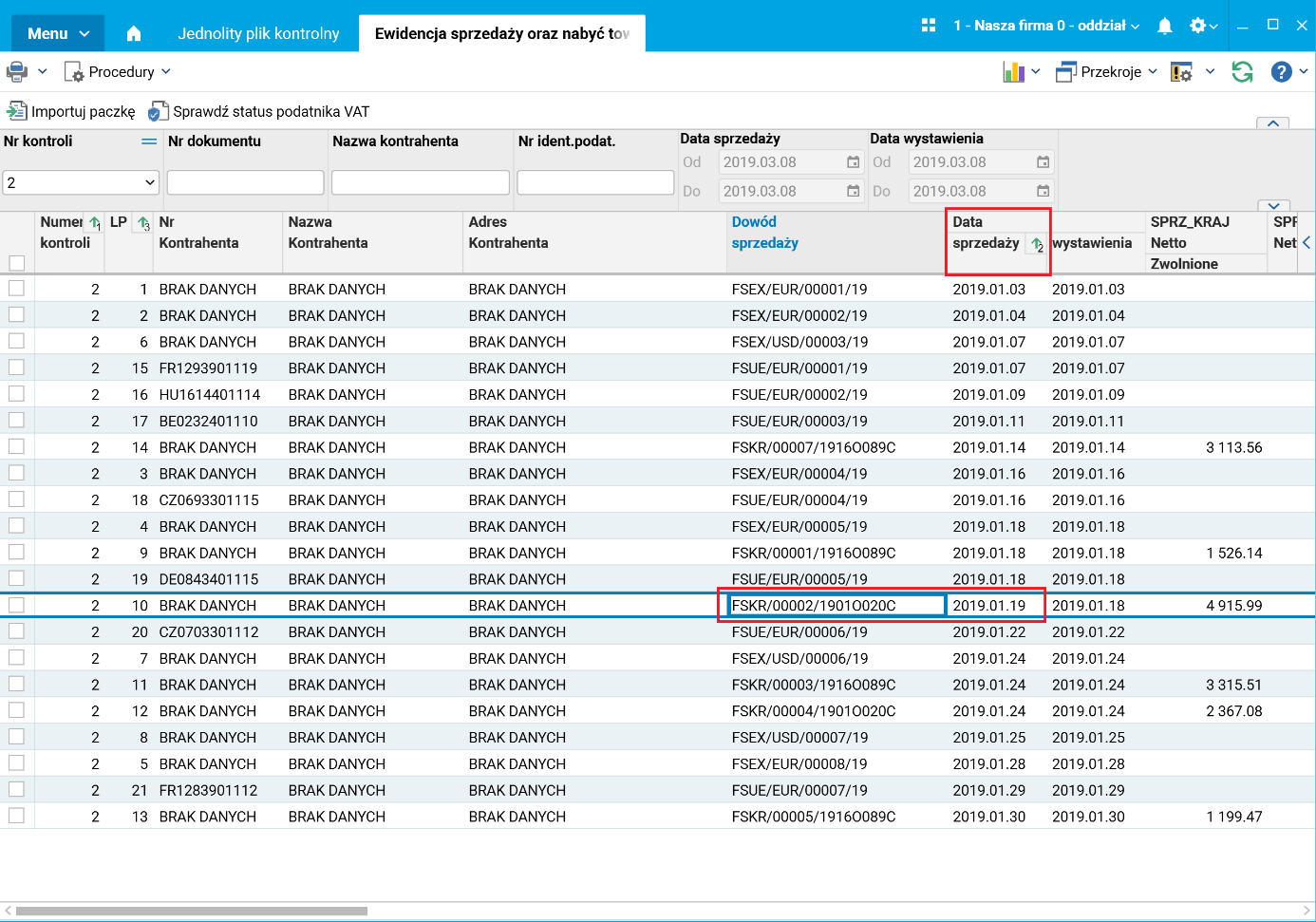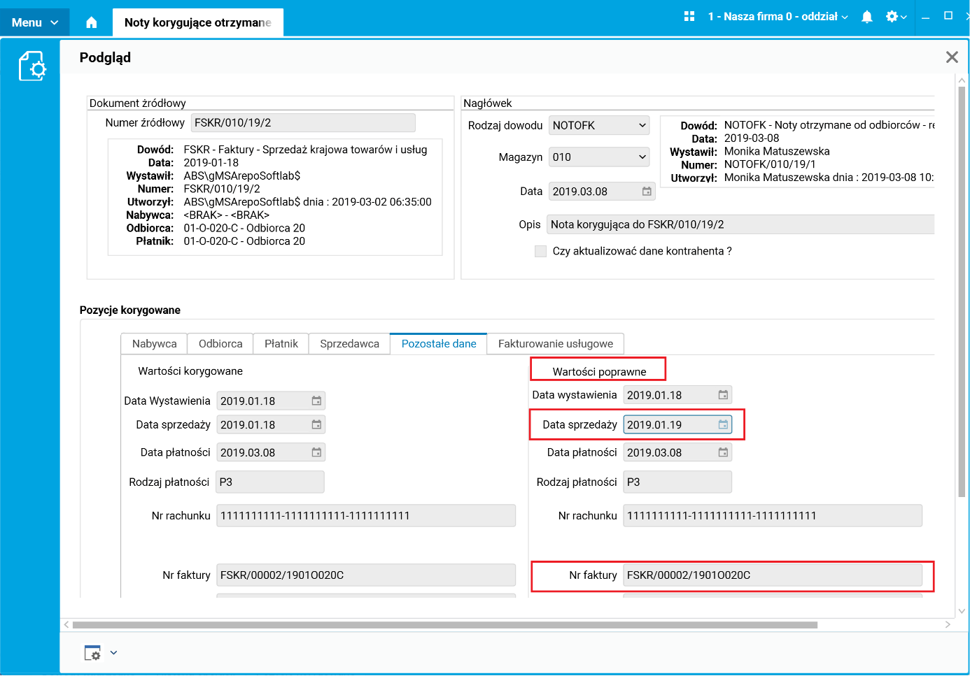 Odbiorca wystawił notę korygującą do tej faktury zmieniającą datę sprzedaży na 2019.01.19.