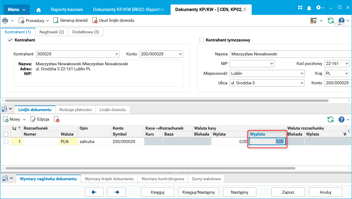 Rys. Kasa – Dokument wpłaty – zablokowana kolumna Wypłata