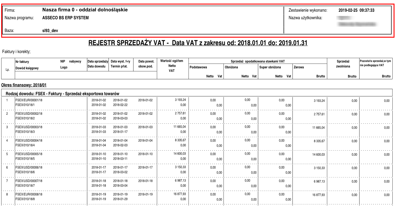 Ponadto w stopce wydruku umieszczone zostały dodatkowe informacje o: