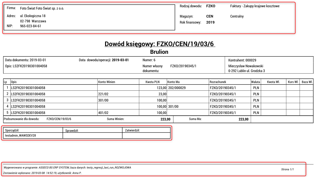 W module FK zaktualizowano wzory wszystkich wydruku zestawień i dowodów księgowych. Celem zmian było ujednolicenie wyglądu nagłówka i stopki wydruków.
