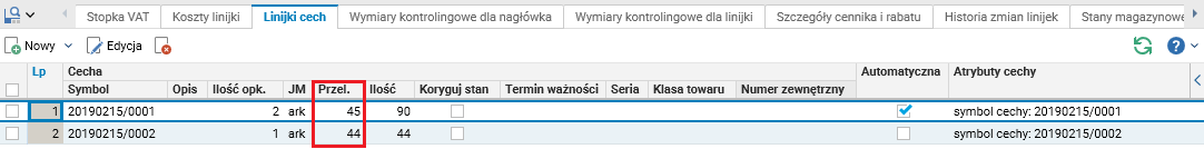 Podczas przyjęcia tego towaru w jednostce ark (np. dokumentem PZ) okazało się, że jeden arkusz waży 44 kg (a nie 45 kg jak wynika z konfiguracji w słowniku Jednostki miary). W takiej sytuacji użytkownik przyjmujący towar może zmienić wartość przelicznika z 45 na 44 na dokumencie PZ, na linijce cechy tego towaru – definiując tym samym indywidualny przelicznik dla przyjmowanej partii towaru.