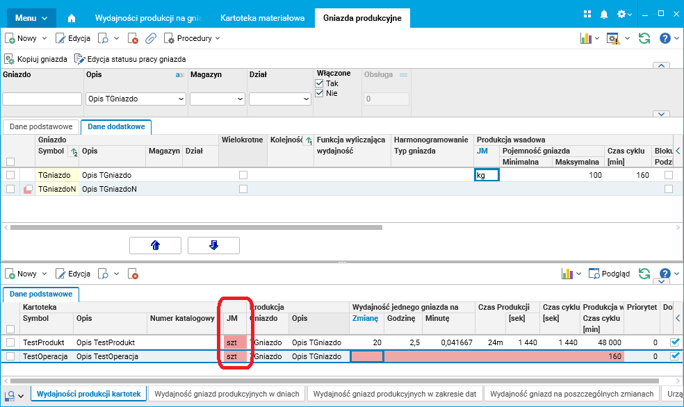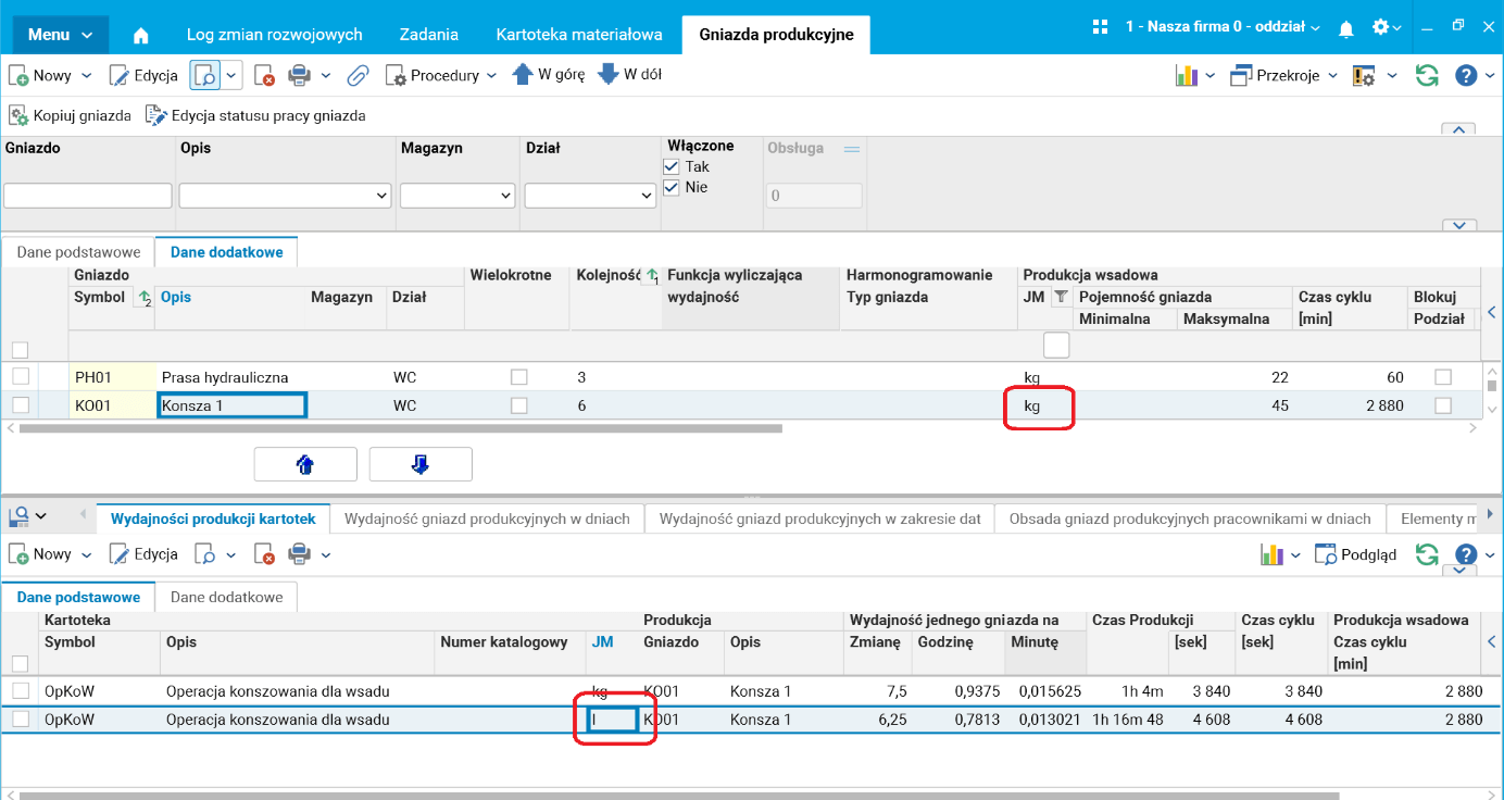 Po wprowadzeniu zmiany, w przypadku gdy jednostka miary pojemności gniazda jest inna niż w definicji wydajności produkcji, wystarczy zdefiniować dla wytwarzanego wyrobu lub wykonywanej operacji technologicznej dodatkową jednostkę miary (słownik Kartoteka materiałowa, szczegół Jednostki miary), tę, w której liczona jest pojemność gniazda. Przelicznik zdefiniowany dla tej jednostki miary zostanie uwzględniony przy wyznaczaniu wydajności produkcji na gnieździe.