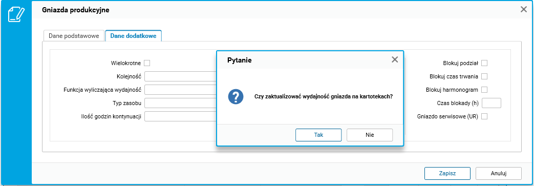 Rys. Komunikat z pytaniem o aktualizację wydajności produkcji po modyfikacji definicji gniazda produkcyjnego