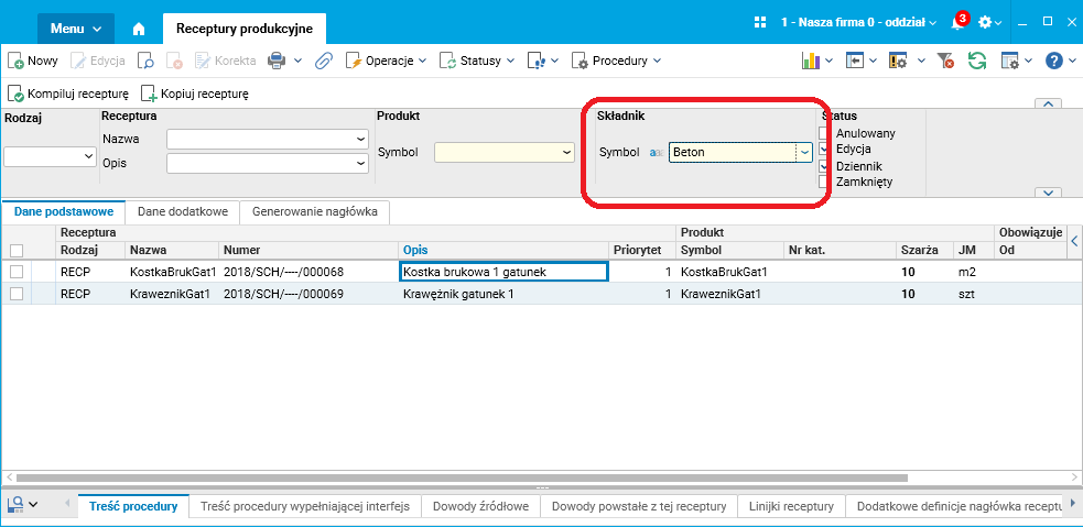 Rys. Rejestr receptur z dodanym filtrem Składnik