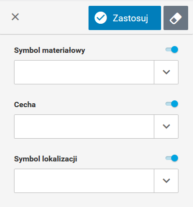 W słowniku Produkty na zostały dodane filtry umożliwiające wyszukiwanie wg symbolu materiałowego z kartoteki produktów (filtr Symbol materiałowy), partii przychodowej produktu (filtr Cecha) i lokalizacji, w której znajduje się produkt (filtr Symbol lokalizacji).