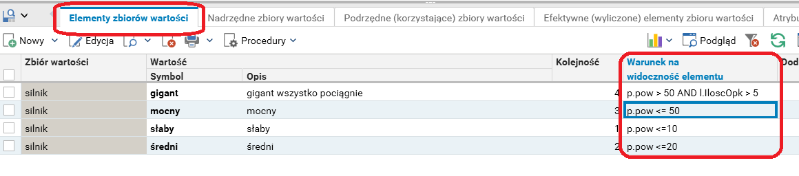 Elementy zbioru wartości są ukrywane/pokazywane w parametrach linijek dowodu dynamicznie, w zależności od tych wartości. Jeżeli warunek widoczności nie zostanie zdefiniowany, to element będzie dostępny zawsze.