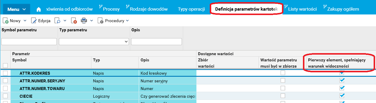 W słowniku Definicje parametrów kartotek dodano pole Pierwszy element, spełniający warunek widoczności. W przypadku gdy do parametru podpięty jest zbiór wartości, to możliwe jest automatyczne wstawienie do parametru pierwszej dostępnej wartości ze zbioru, spełniającej warunek na widoczność (wg kolejności ustalonej dla elementów zbioru wartości). Jeżeli wstawiony do parametru linijki element zbioru wartości przestaje być widoczny (nie spełniony jest warunek widoczności), a w definicji nie została zaznaczona wspomniana opcja, to wartość parametru zostanie pusta.