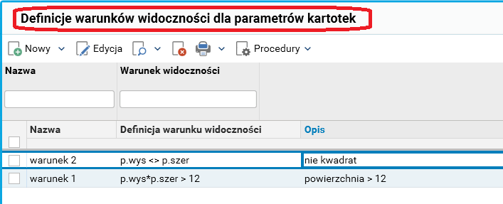 Rys. Definicje warunków widoczności dla parametrów kartotek