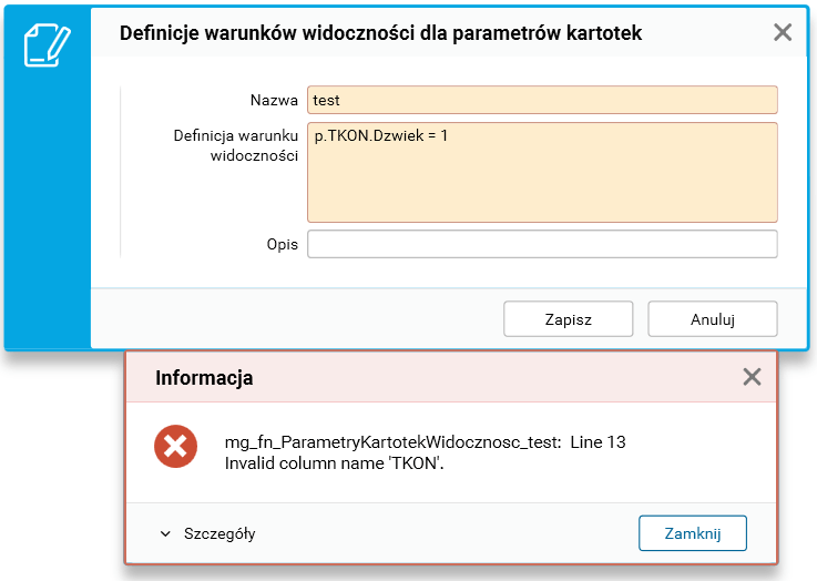 Jeżeli w nazwie parametru występuje kropka – (.) np. „TKON.Dzwiek” to używając takiego parametru w formułach wyliczających jego wartość lub przy definiowaniu warunku widoczności (zarówno dla Elementów zbiorów wartości jak i dla Parametrów kartotek) należy obudować go nawiasami kwadratowymi [] – p.[TKON.Dzwiek]. W przeciwnym przypadku podczas definiowania warunku widoczności system zasygnalizuje błąd.