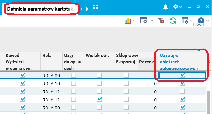Ponadto, jeżeli wartość parametru ma być uwzględniana w formułach wyliczających wartość parametru lub w definicji warunku widoczności (zarówno dla Elementów zbiorów wartości jak i dla Parametrów kartotek), to parametr musi mieć zaznaczoną opcję Używaj w obiektach autogenerowanych.