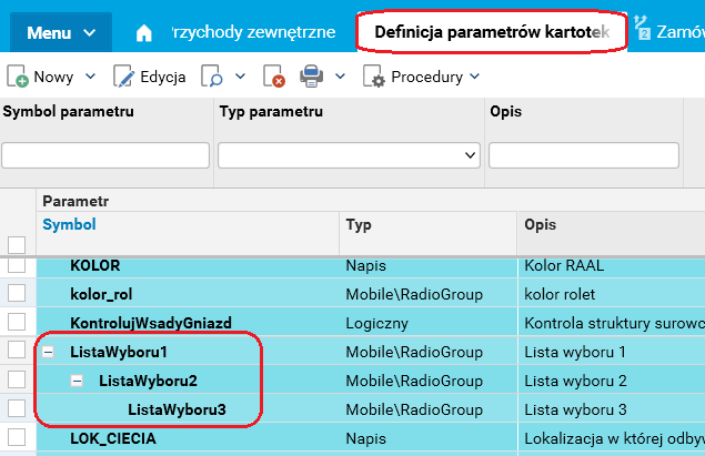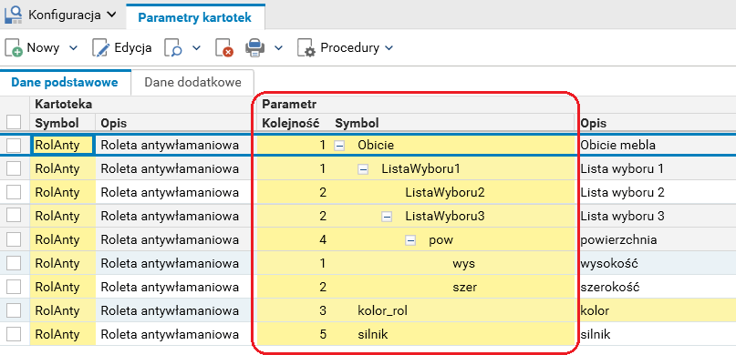 Umożliwiono definiowanie struktury dla parametrów kartotek i wyświetlanie ich w strukturze drzewa. Taka możliwość została dodana na linijkach dokumentów oraz w słownikach Kartoteka materiałowa i Grupy materiałowe. Dzięki temu możliwe stało się operowanie na całych grupach parametrów stanowiących gałąź, np. dodawanie całej grupy parametrów do kartoteki lub sterowanie widocznością grupy parametrów.