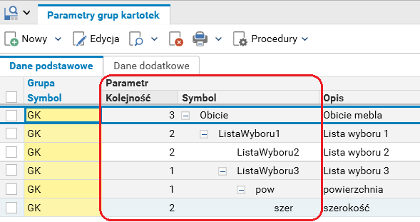 Ten sam parametr może być jednocześnie przypisany do kartoteki i do grupy. Kolejność ustalamy oddzielnie dla grupy i kartoteki. Jeżeli oglądamy parametry z poziomu słownika Grupy materiałowe, to widok będzie odzwierciedlał sposób przypisania do grupy. Kolejność przypisania do grupy może być inna niż kolejność przypisania do kartoteki.