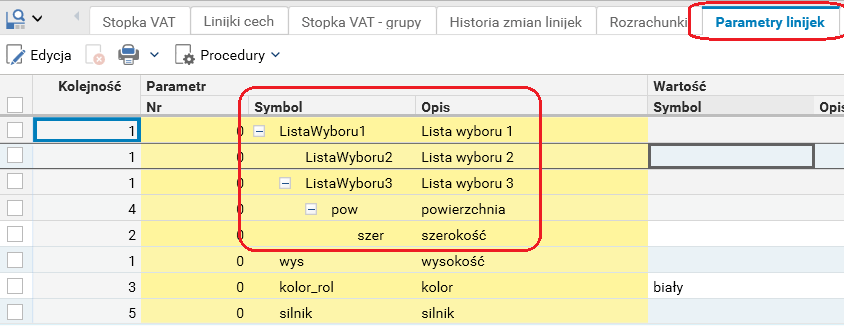 Struktura hierarchiczna jest widoczna również na dowodach, w szczególe Parametry linijek.