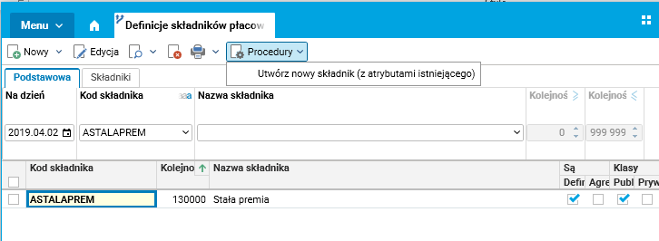 Zaczyna od zdefiniowania nowego składnika. W tym celu uruchamia słownik Definicje składników płacowych i w nim na liście składników wyszukuje składnik o zbliżonych parametrach. Uznaje, że składnik o kodzie ASTALAPREM jest wystarczająco podobny do tego, który musi utworzyć. Następnie uruchamia procedurę Utwórz nowy składnik (z atrybutami istniejącego) i wypełnia jej parametry:
