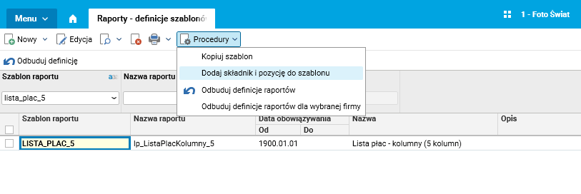 Procedura Dodaj składnik i pozycję do szablonu umożliwia dodanie składnika do szablonu wydruku raportu, w tym przypadku listy płac. Tak wygląda słownik Raporty – definicje szablonów zawierający opisywaną procedurę: